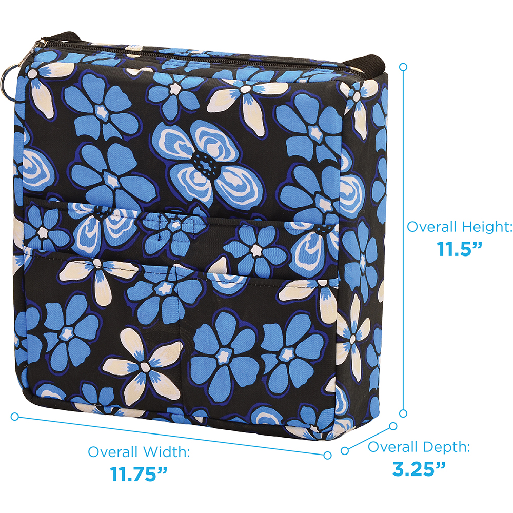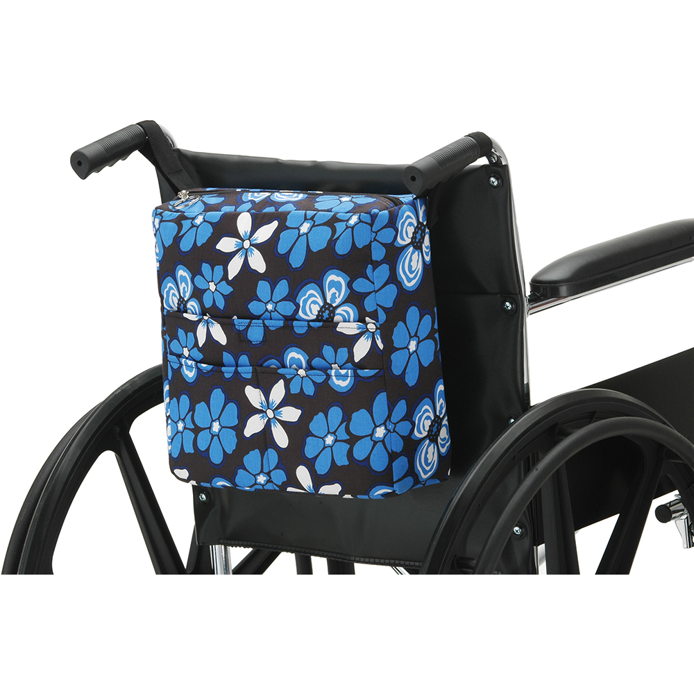 The Hanging Mobility Bag fits on all walkers and the back of wheelchairs and transport chairs. It easily attaches to the front of the crossbar or handles with two Velcro straps. The top zipper includes a key ring for easy opening and closing. Great for lightweight personal items.