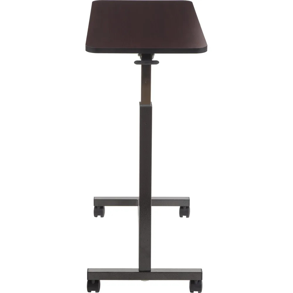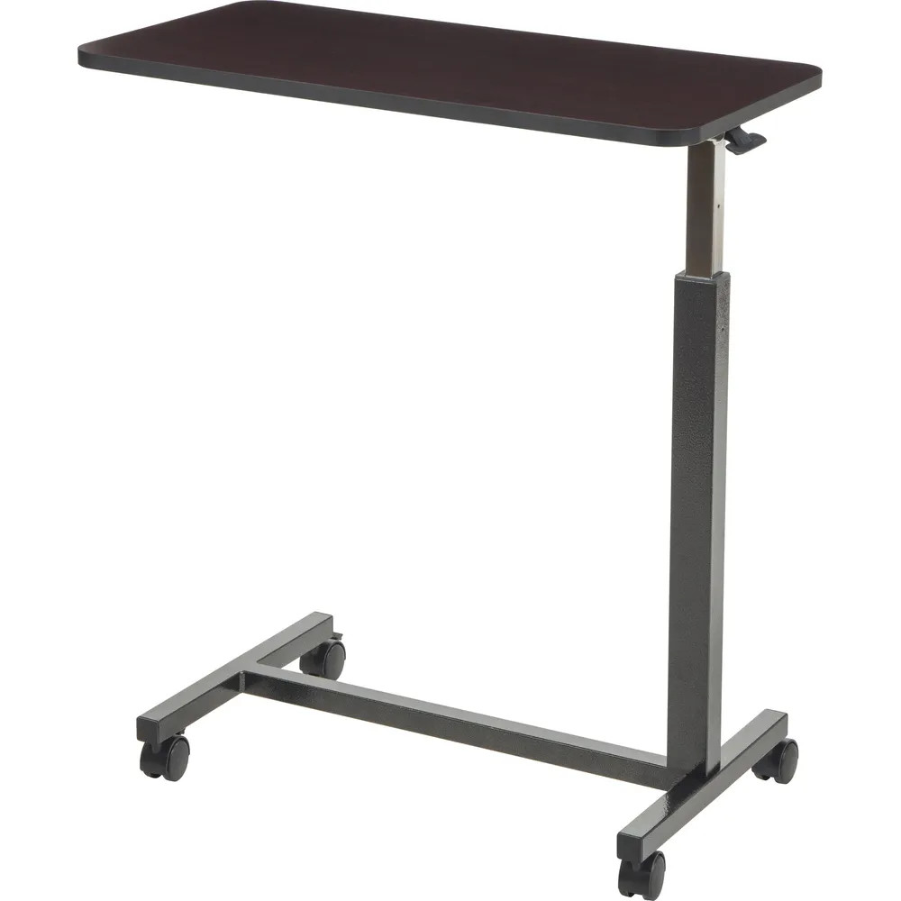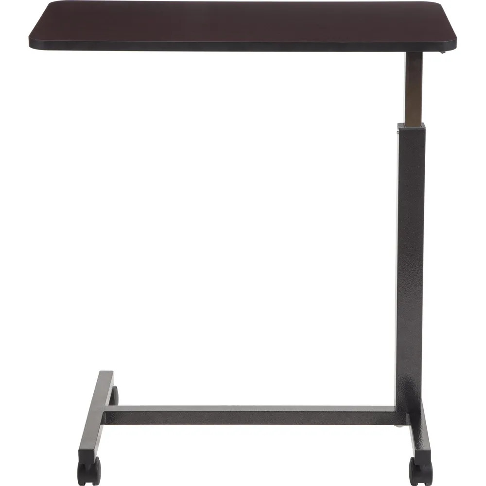 The Panacea® Overbed Table offers a stable and adjustable surface ideal for bedside use in healthcare and senior living environments. It features a spacious 30" L x 15" W walnut-finish tabletop supported by a sturdy gray H-base for enhanced stability. The table height adjusts smoothly from 29" to 42.25" using a spring-loaded mechanism, making it easy to customize for different users and activities. Designed for durability and convenience, this overbed table is a practical solution for meals, reading, or medical equipment access.