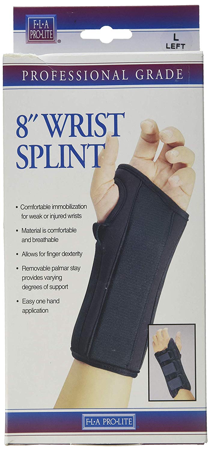Wrist Splint Support Brace 8", Pro-Lite FLA Orthopedics Medium Left Wrist. The Pro-Lite 8" Wrist Splint is ideal for sprains, strains or after cast removal. Also can be used as a wrist splint for tendonitis or carpal tunnel. This carpal tunnel wrist splint provides support for weak or injured wrists and allows for full finger dexterity and improved grip strength. The material is comfortable, breathable, and ideal for latex sensitive people. Available in 5 sizes. Black. Select either right or left wrist below. One wrist splint per package.
